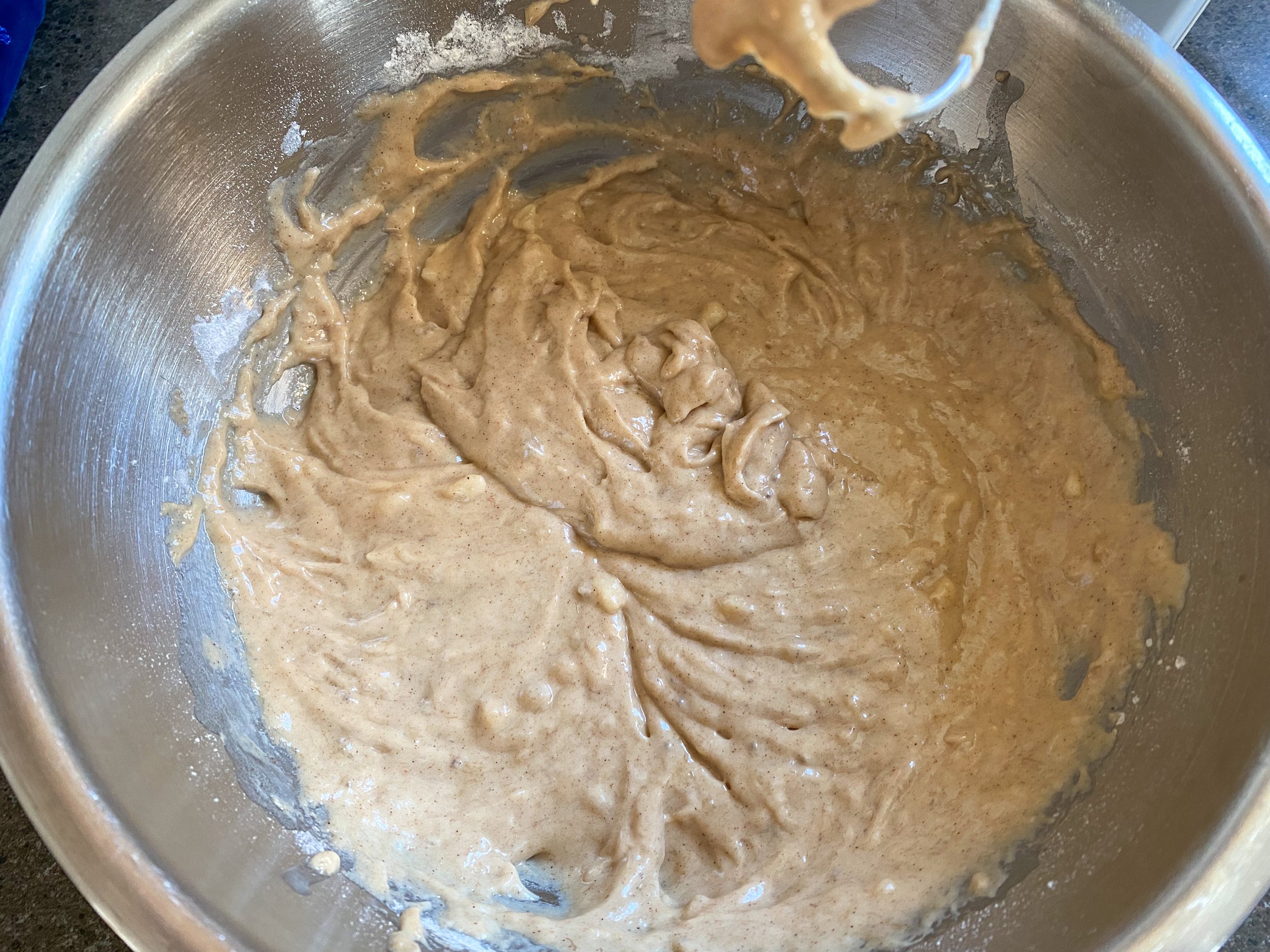 Using a hand mixer, combine mashed bananas, granulated sugar, brown sugar, vanilla, egg, and cinnamon. In a separate bowl, sift flour, baking soda, baking powder, and salt. Add dry mixture to wet banana mixture and mix until just combined. Finish with mixing in melted butter.
