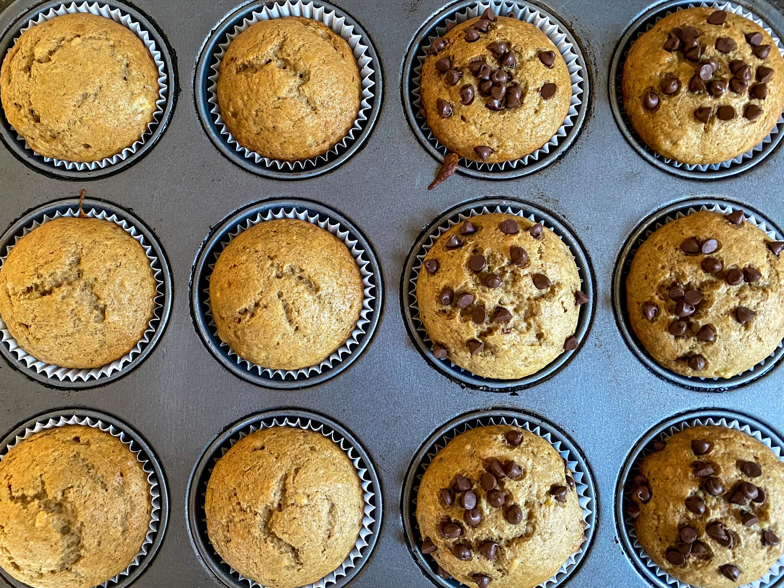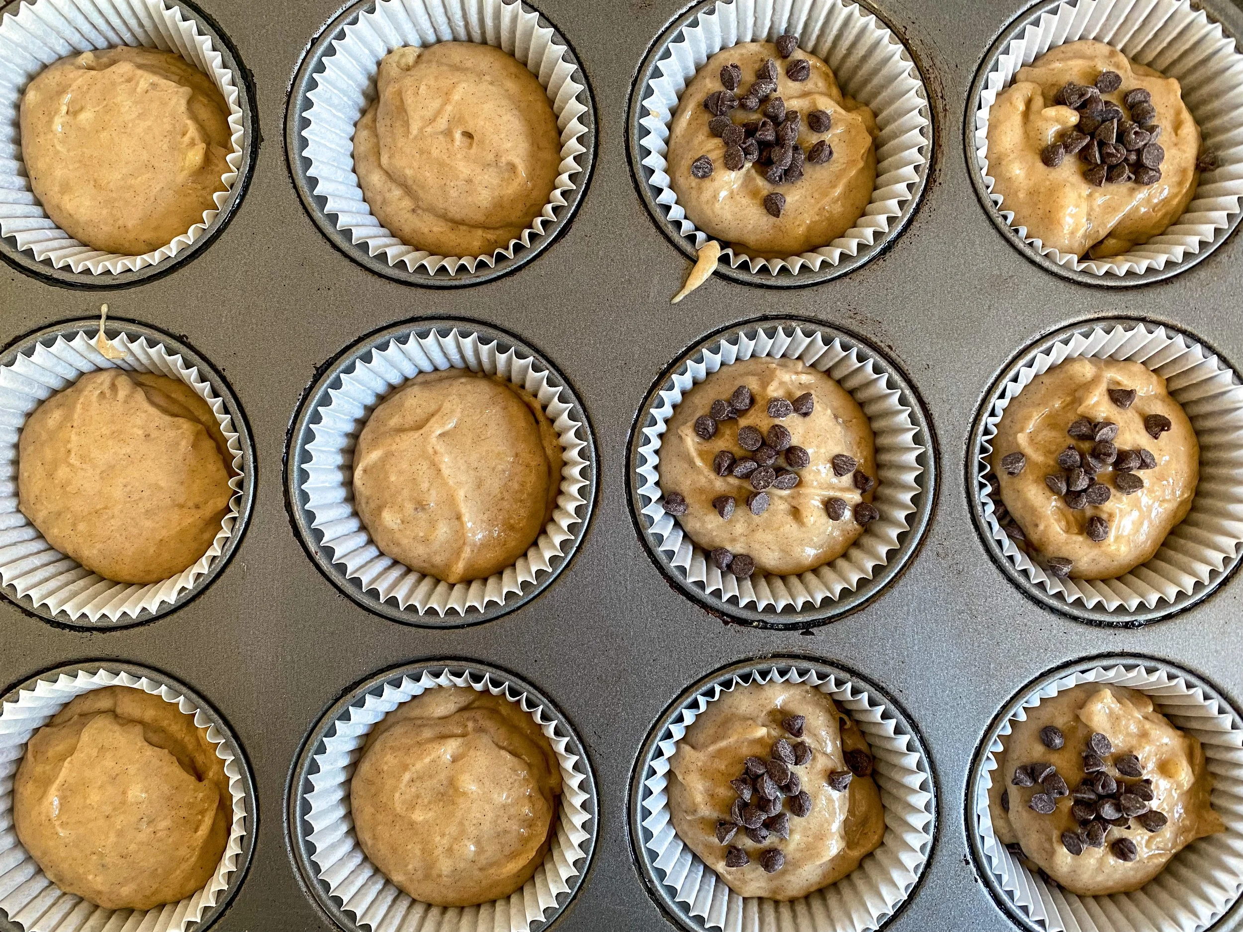 - Using a cookie scoop, fill each muffin tin with ~2 scoops of batter. Optional to add mix-ins including chocolate chips or chopped nuts.