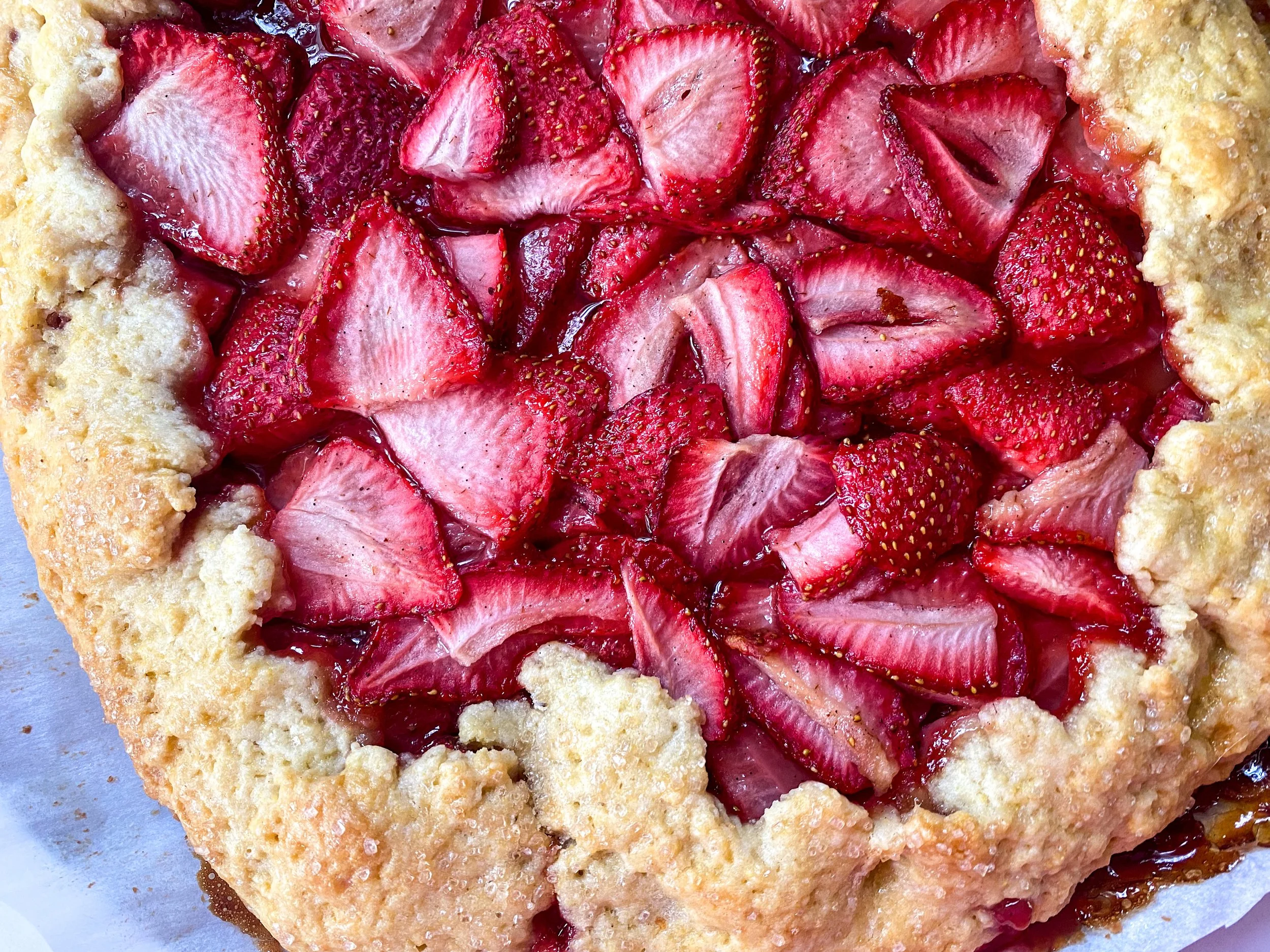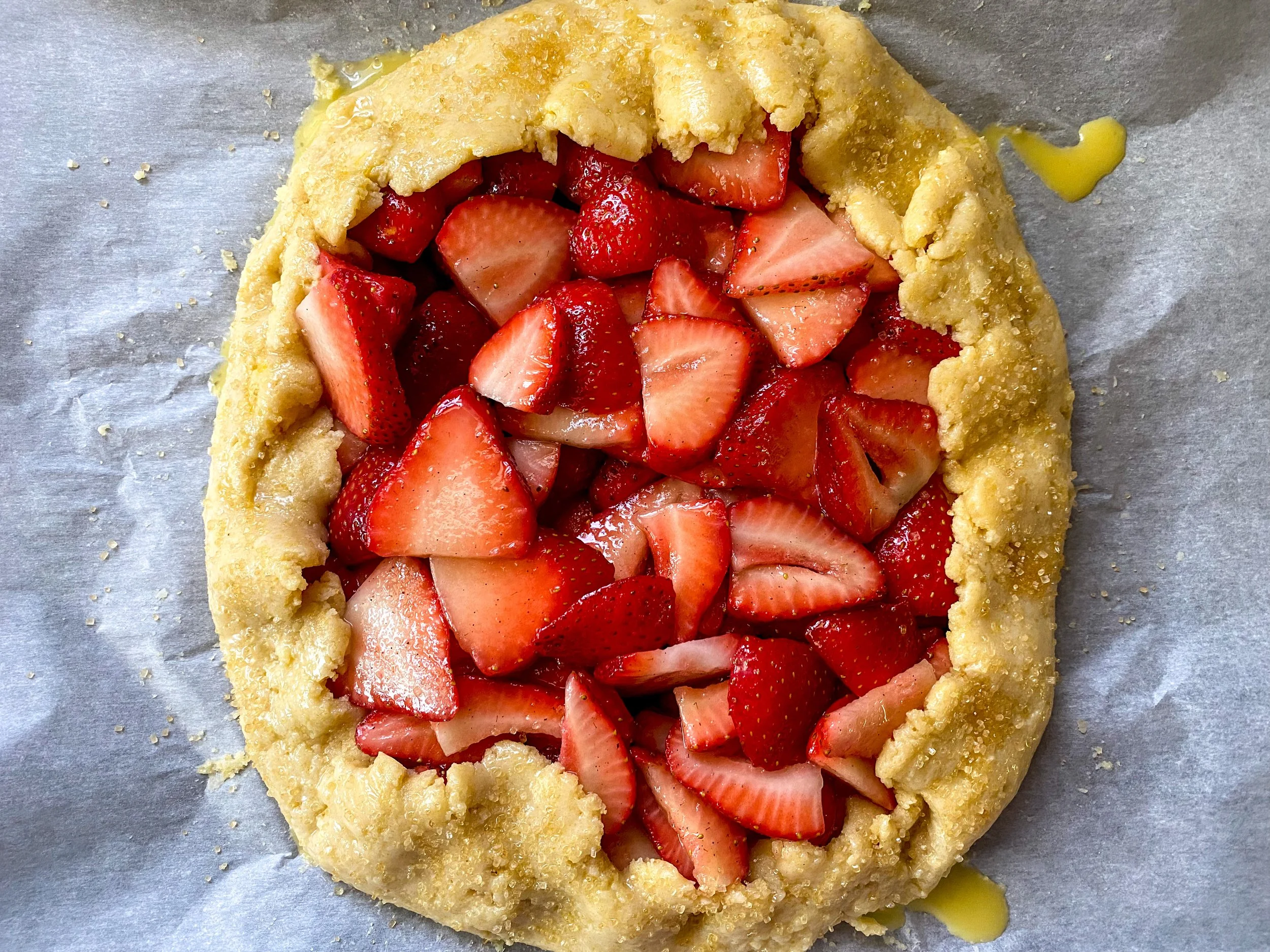Place a piece of parchment paper on a work surface. Roll out the dough to a 12ish diameter. I like to use a piece of saran wrap to in between the dough and the rolling pin to keep the dough from sticking. Transfer the crust on the parchment paper to a baking sheet. Spoon the strawberries in the middle of the crust and and arrange so there is a 2-3 inch boarder for the crust. Fold the crust over the strawberries. Coat crust with egg wash and sprinkle with sugar.